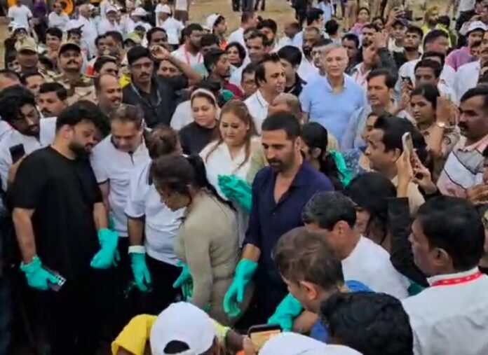 Bollywood superstar Akshay Kumar was spotted on Juhu beach in Mumbai this Sunday, but not for a film shoot. The actor rolled up his sleeves and joined a major beach clean-up drive, a day after the Ganpati Visarjan celebrations.
