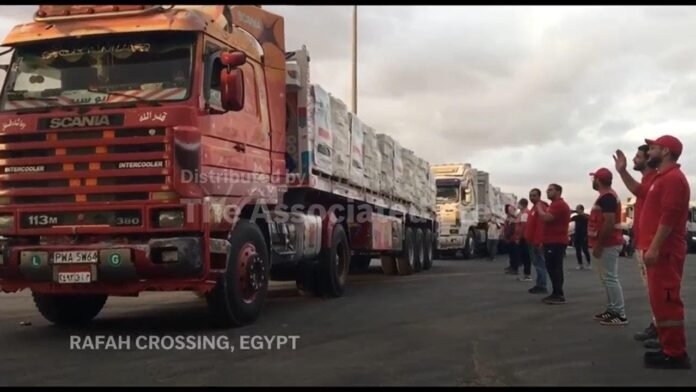 Dozens of trucks loaded with humanitarian aid for Gaza drove through the Egyptian side of the Rafah crossing on Sunday.